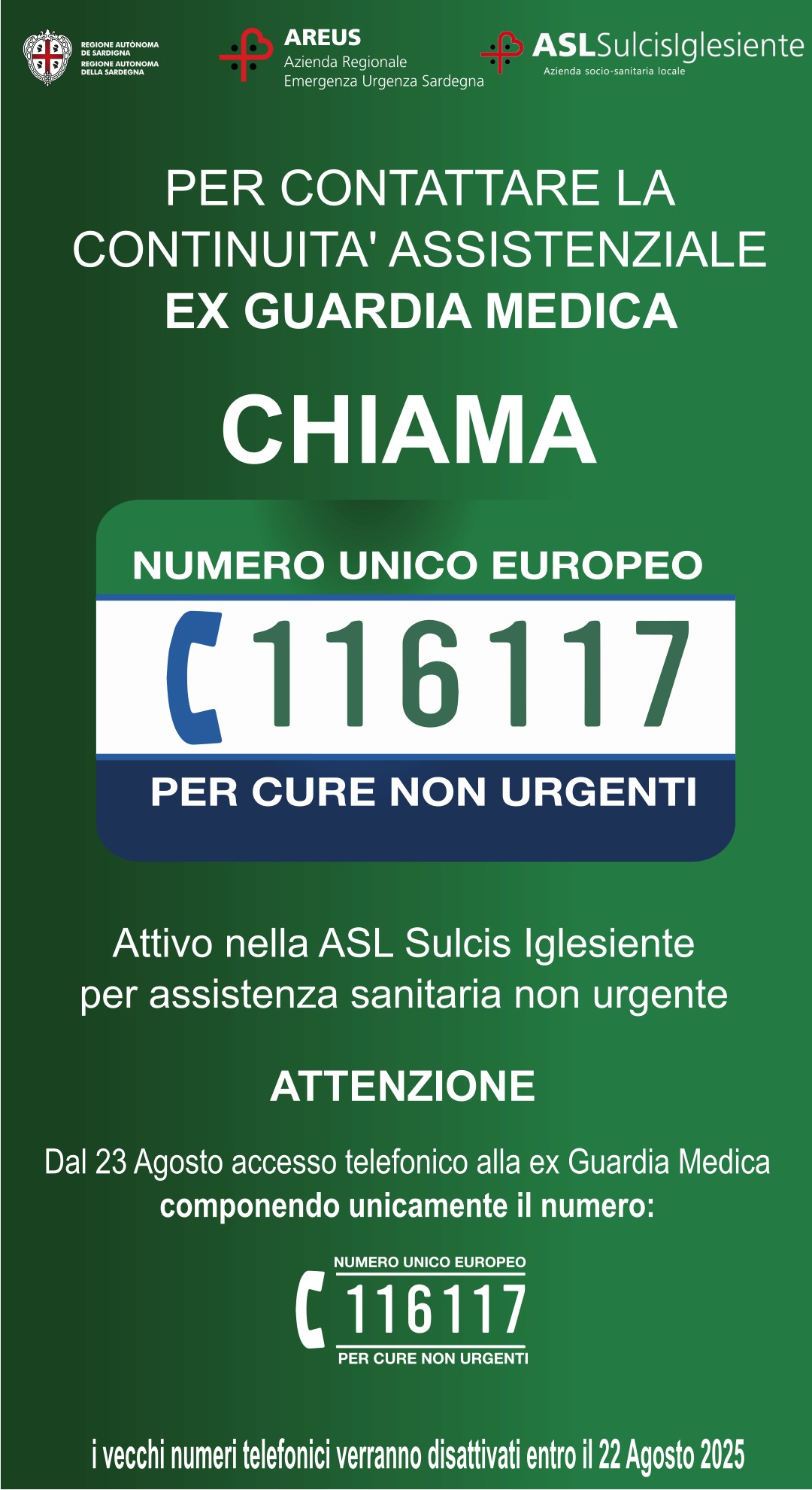 A partire dal 23 agosto, la Continuità Assistenziale (ex Guardia Medica) sarà raggiungibile esclusivamente tramite il numero unico nazionale 116117