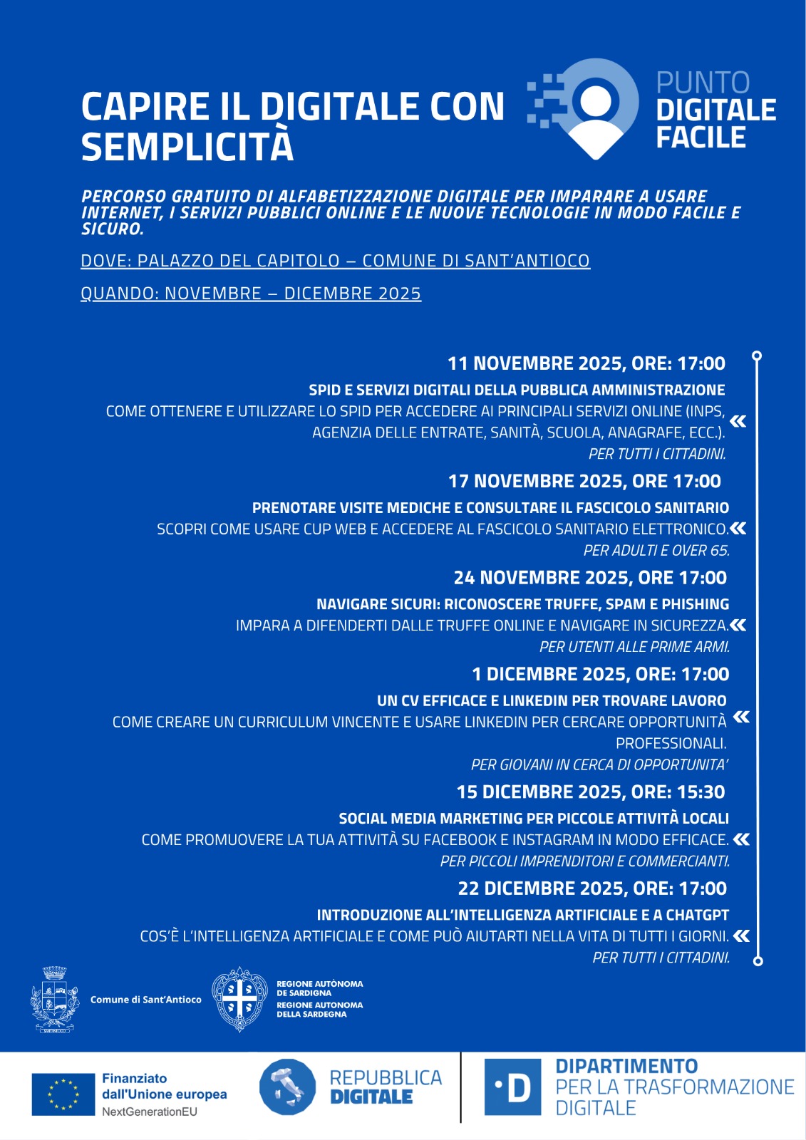 Nell’ambito della digitalizzazione dei servizi della pubblica amministrazione, e non soltanto, il Comune di Sant’Antioco e il “Punto Facile Digitale”, ufficio attivo presso il Municipio, organizzano una serie di incontri rivolta ai cittadini: un percorso gratuito di alfabetizzazione digitale per imparare a usare internet, i servizi pubblici online e le nuove tecnologie in modo facile e sicuro. Gli appuntamenti (sei in totale, destinati a diverse fasce di popolazione) si terranno presso la sala conferenze del Palazzo del Capitolo, in piazza De Gasperi, nei mesi di novembre e dicembre.