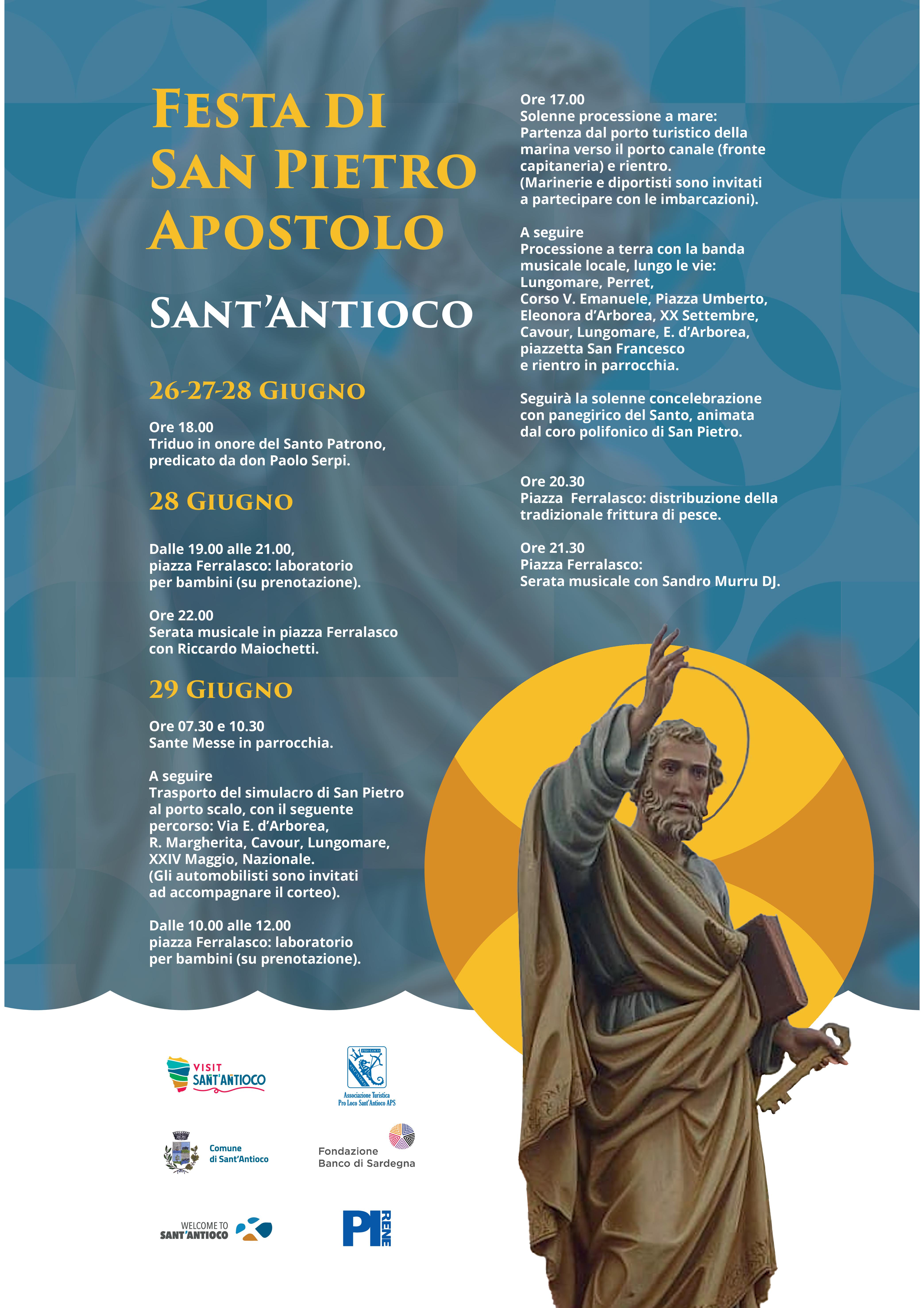Domenica 29 giornata clou. Alle 07.30 e alle 10.30 Sante Messe in parrocchia e a seguire il trasporto del simulacro di San Pietro al porto scalo, con il seguente percorso: Via E. d'Arborea, R. Margherita, Cavour, Lungomare, XXIV Maggio, Nazionale (Gli automobilisti sono invitati ad accompagnare il corteo). Dalle 10.00 alle 12.00, in piazza Ferralasco, ancora laboratori per bambini (su prenotazione). Alle 17.00, il momento più atteso e suggestivo: la Solenne processione a mare con partenza dal porto turistico della marina verso il porto canale (fronte capitaneria) e rientro (Marinerie e diportisti sono invitati a partecipare con le imbarcazioni). A seguire Processione a terra con la banda musicale locale, lungo le vie: Lungomare, Perret, Corso V. Emanuele, Piazza Umberto, Eleonora d'Arborea, XX Settembre, Cavour, Lungomare, E. d'Arborea, piazzetta San Francesco e rientro in parrocchia. Seguirà la solenne concelebrazione con panegirico del Santo, animata dal coro polifonico di San Pietro. E poi, alle 20.30, in Piazza Ferralasco, la tradizionale e immancabile distribuzione della frittura di pesce. Chiuderà la festa, alle 21.30, la serata musicale con Sandro Murru DJ.