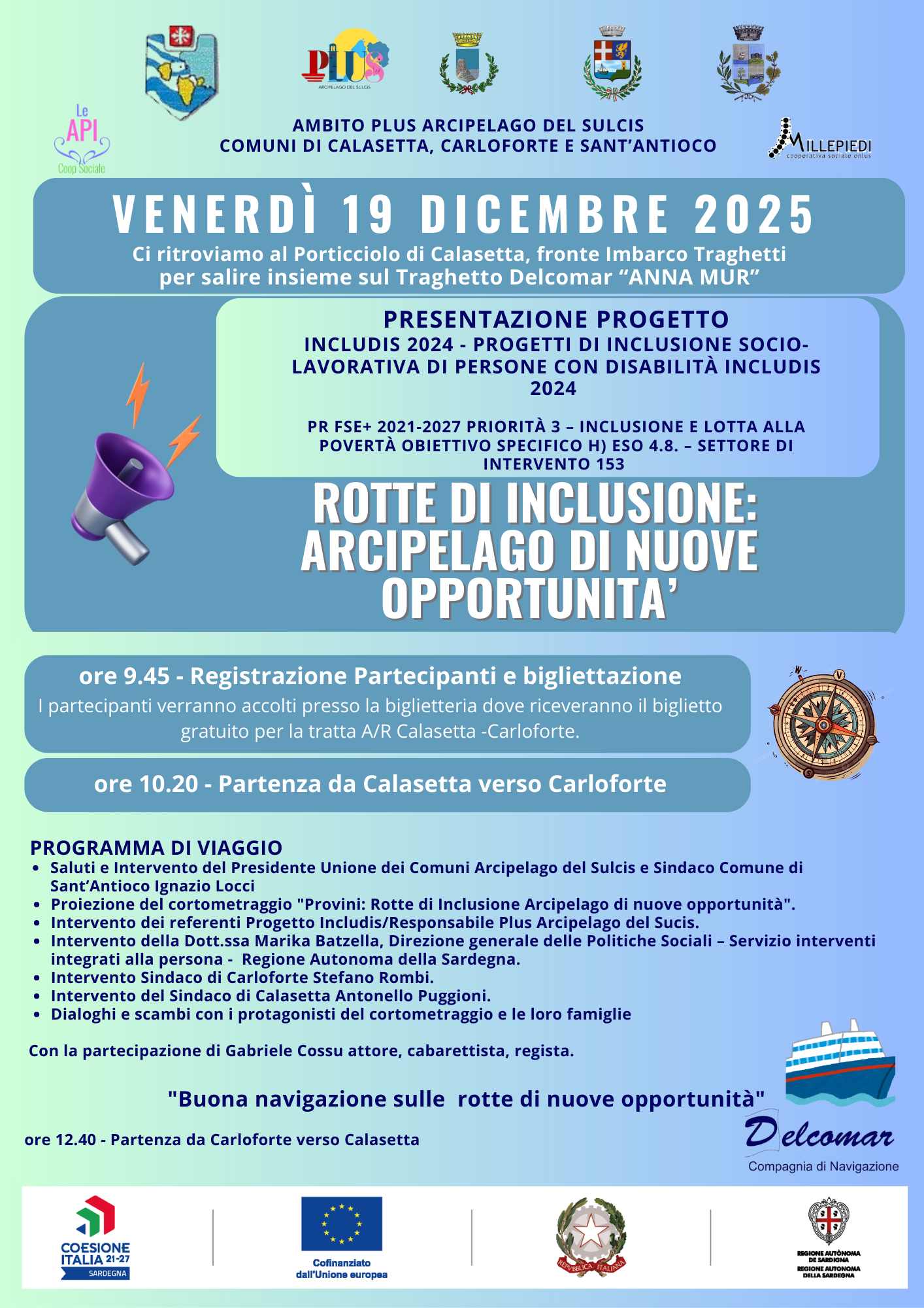 Il Comune di Sant’Antioco informa che venerdì 19 dicembre verrà presentato il Progetto INCLUDIS 2024 – Rotte di Inclusione: Arcipelago di Nuove Opportunità, co- progettato dall’Ambito Plus Arcipelago delle Isole con la Cooperativa Sociale Le Api e la Cooperativa Sociale Millepiedi.