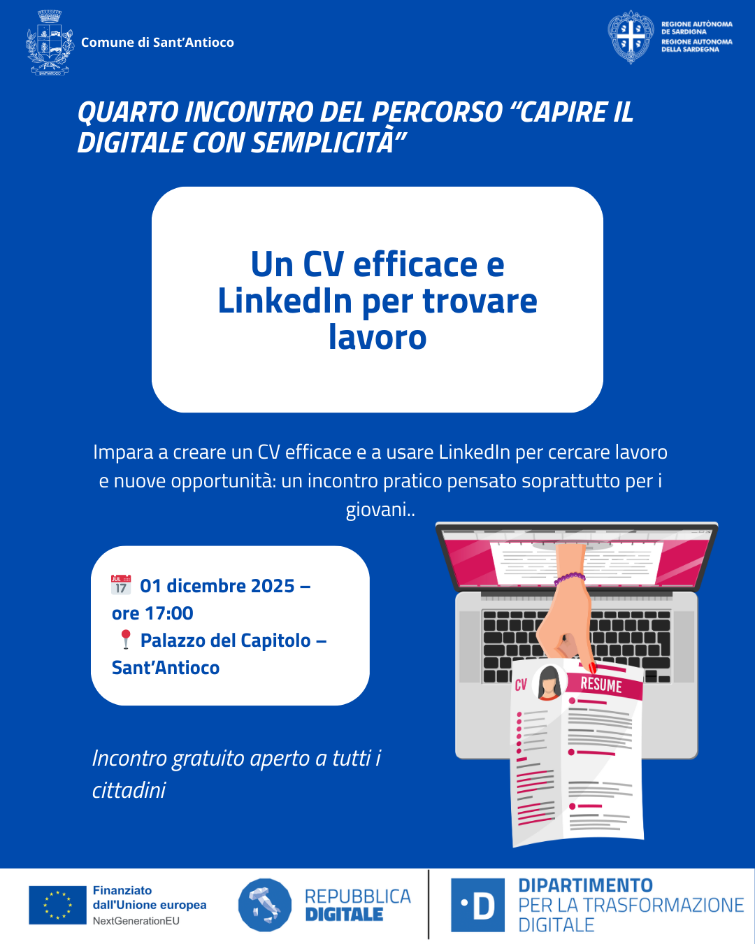 Il quarto appuntamento del percorso “Capire il digitale con semplicità” è dedicato a come costruire un curriculum davvero efficace e utilizzare LinkedIn per trovare nuove opportunità professionali. Durante l’incontro i partecipanti scopriranno come presentare al meglio competenze ed esperienze, quali informazioni inserire nel CV e quali evitare, come valorizzare i propri punti di forza e come adattare il curriculum alle diverse candidature.