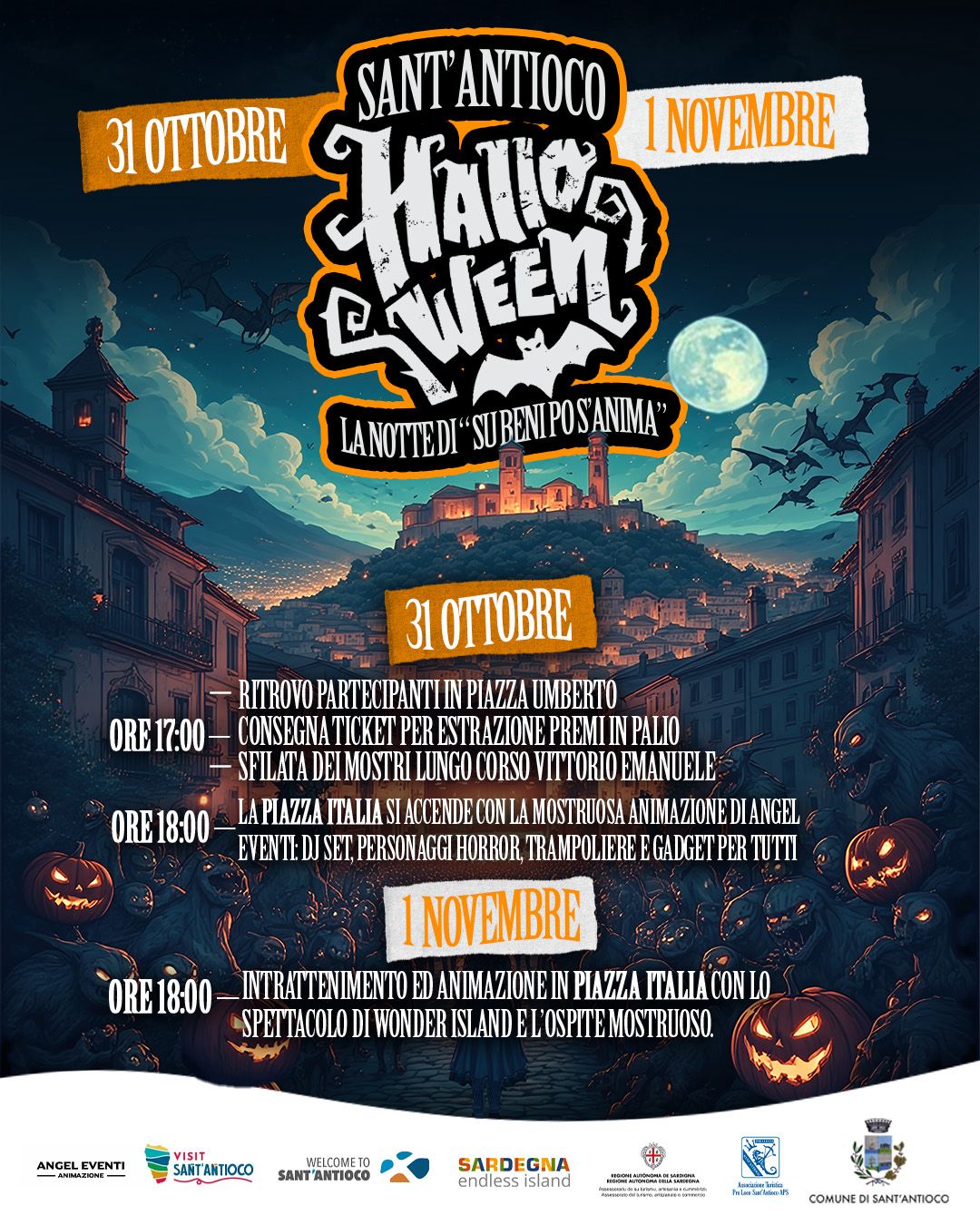 Il Comune di Sant’Antioco invita le famiglie alla partecipazione per due notti imperdibili immerse nell’oscurità di Halloween e di “Su beni po s’anima”, tra tradizioni antiche e risate che sfidano la paura.