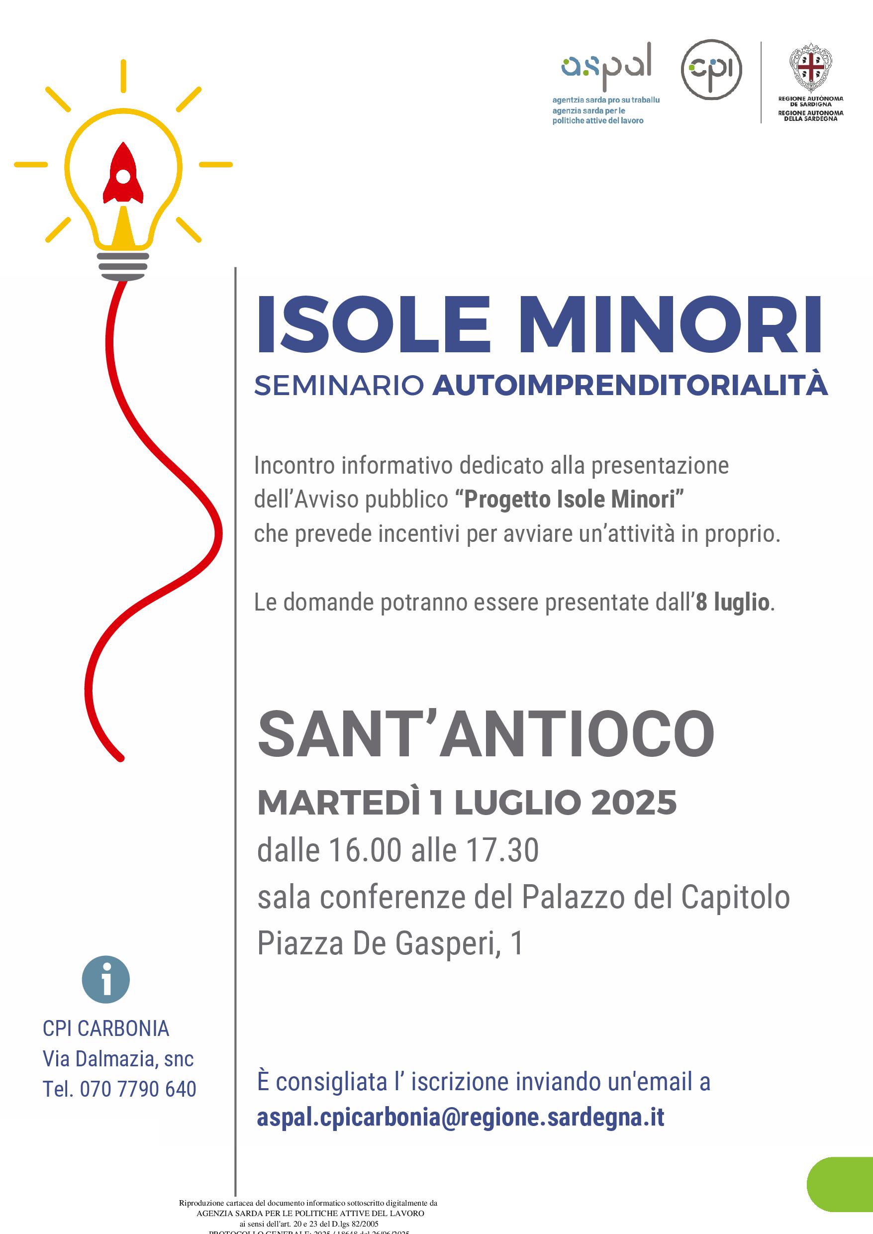Il Comune di Sant’Antioco informa che martedì 1 luglio, dalle 16.00 alle 17.30, presso la sala conferenze del Palazzo del Capitolo, Piazza de Gasperi (stabile biblioteca comunale), è in programma un importante incontro informativo dedicato alla presentazione dell’Avviso pubblico “Progetto Isole Minori”, che prevede incentivi per l’avvio di un’attività in proprio.